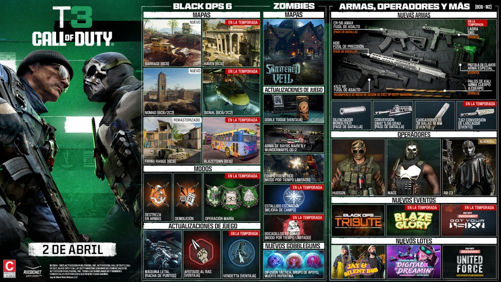 Activision ha dado inicio a la Temporada 3 de Call of Duty: Black Ops 6 y Call of Duty: Warzone, que trae de vuelta a Verdansk, el mapa original del Battle Royale, 3 nuevos mapas y 2 modos multijugador al PvP de Black Ops 6, novedades al Modo Zombies, entre otras novedades gratuitas. Adicionalmente, debuta otro pase de temporada con más de 100 recompensas, incluyendo a los operadores Mace y Hudson, además de armas base de la era de Verdansk, como el CR-56 AMAX y HDR.